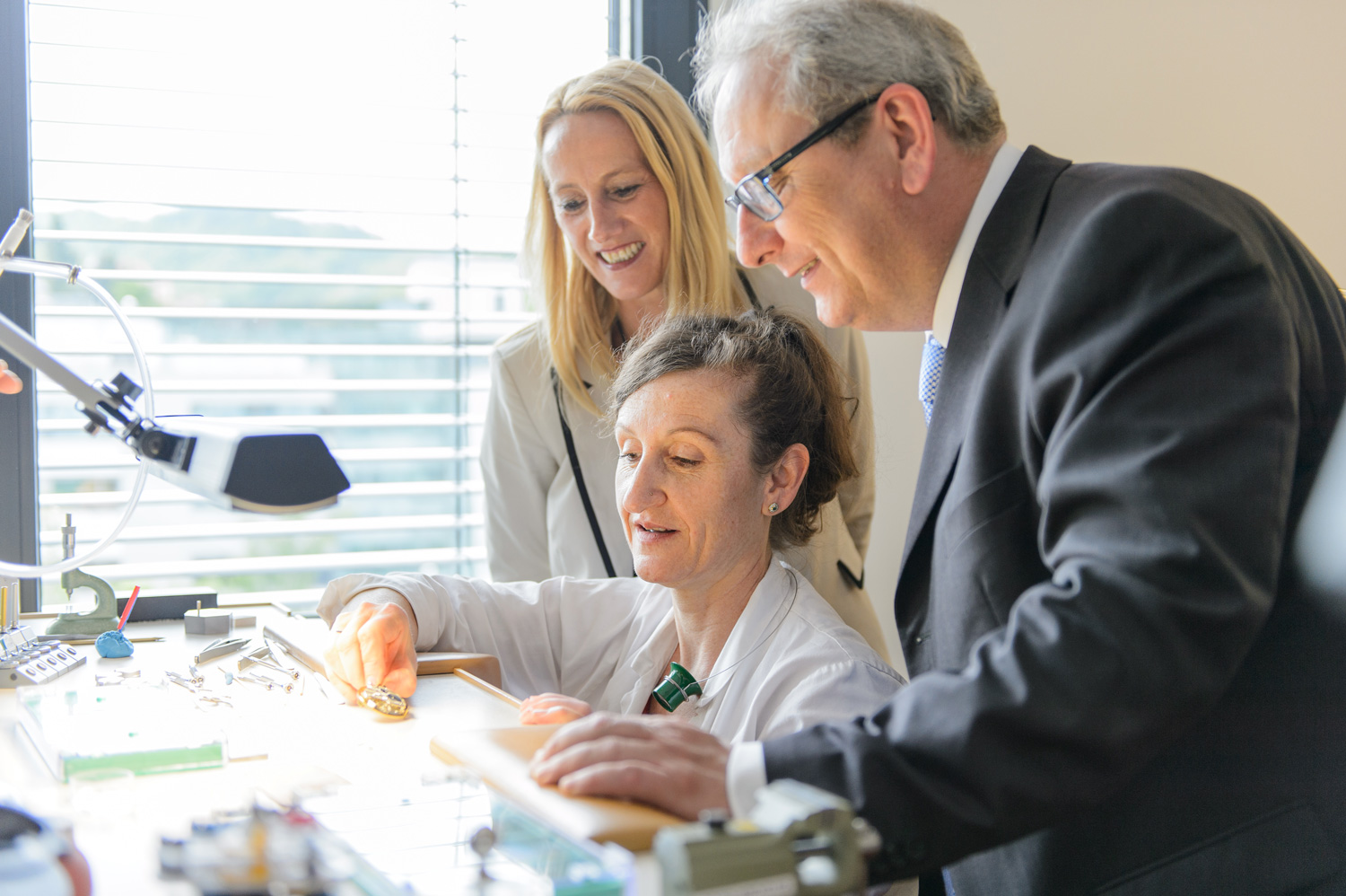 Sachsens Europaminister Dr. Jürgen Martens machte anlässlich seiner Veranstaltungsreisen zur diesjährigen Europawahl auch Station in Glashütte. Bei einer Führung durch die 2013 eingeweihte Manufaktur Moritz Grossmann erhielt Staatsminister Martens am 15. Mai Einblicke in die Philosophie der jungen Glashütter Uhrenmarke. Geschäftsführerin Christine Hutter präsentierte Dr. Jürgen Martens die Unternehmensentwicklung und die uhrmacherischen Details.