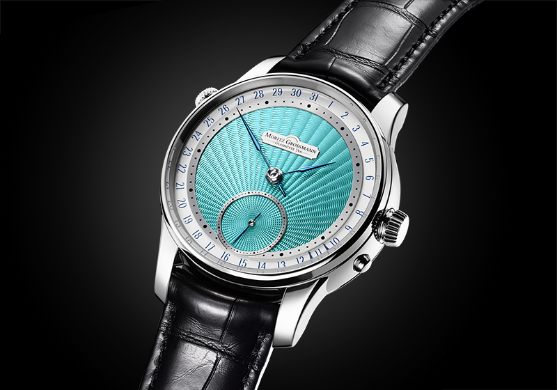 Moritz Grossmann lanciert Datumsuhr mit guillochiertem Zifferblatt in der Trendfarbe Türkis Guillochiertes Zifferblatt in Türkis Springende Datumsanzeige Umlaufende Datumsskala mit klammerförmigem Dat...