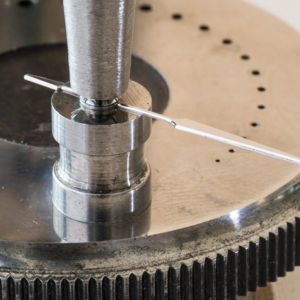 Die Zeiger werden in vielen aufwändigen Schritten in der Hand jeweils eines Meisters seines Faches gefertigt. Breite Fasen verleihen den Zeigern Körperlichkeit und lassen sie dabei betont schlank erscheinen. An einer Holzscheibe werden die Fasen der Zeiger aus der freien Hand hochglanzpoliert.