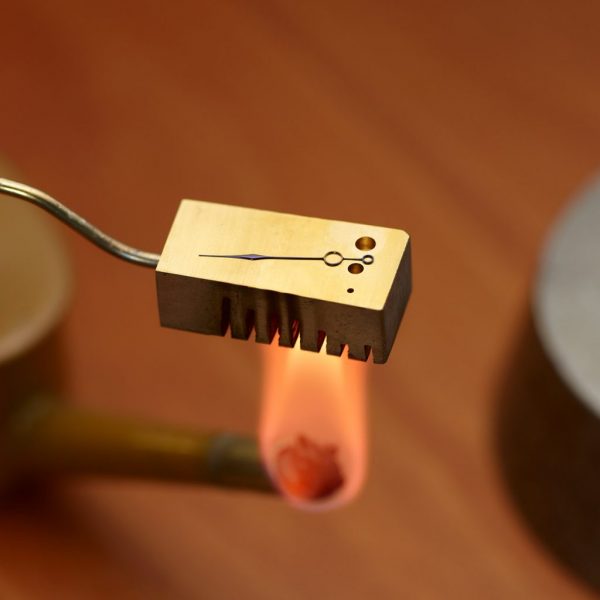 Zeiger aus Stahl werden über dem offenen Feuer angelassen. Als Anlassfarbe wurde Braunviolett bzw. Braun gewählt. Für beide Stahlfarben steht beim Anlassen nur ein kleiner Temperaturbereich zur Verfügung, so dass hier viel Erfahrung, ein präzises Augenmaß und ein exaktes Gefühl für den richtigen Augenblick erforderlich sind. Das Auge der Zeiger verbleibt in seiner polierten Stahlfarbe und bildet damit einen wirkungsvollen Kontrast zum edlen Braunviolett bzw. Braun.