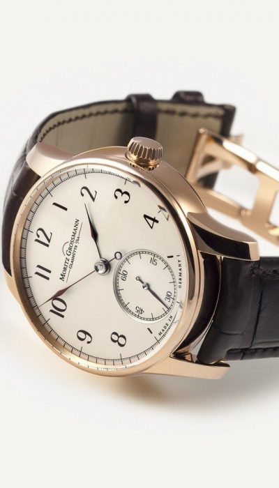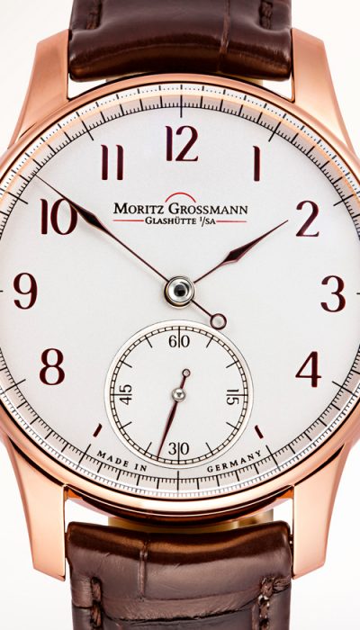 In der oberen Mitte – unterhalb der “12” – ist die Uhr mit dem traditionellen Schriftzug MORITZ GROSSMANN GLASHÜTTE I/SA signiert; der kleine Halbbogen über dem Namenszug symbolisiert und wiederholt den für die Marke typischen Ausschnitt in der 2/3-Platine des Uhrwerkes, damit ihr Herz – die Schraubenunruh – durch den Saphirboden gut sichtbar ist.