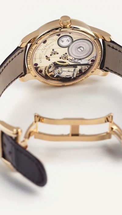 Annähernd 200 handgefertigte Einzelteile greifen in einem dreiteiligen Gehäuse aus Gold oder Platin präzise ineinander. Sie sind der Beweis innovativer Handwerkskunst und durch den Saphirglasboden sichtbar.