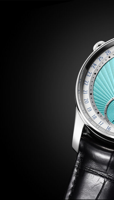 Die guillochierten Muster auf dem Zifferblatt und der kleinen Sekunde aus massivem Silber werden mit einer Spezial-Beschichtung versehen. In Abhängigkeit vom Winkel des einfallenden Lichtes wirkt ein dynamisches Spiel zarter Türkisnuancen, das an Sonnenstrahlen auf einer schimmernden Wasseroberfläche erinnert.