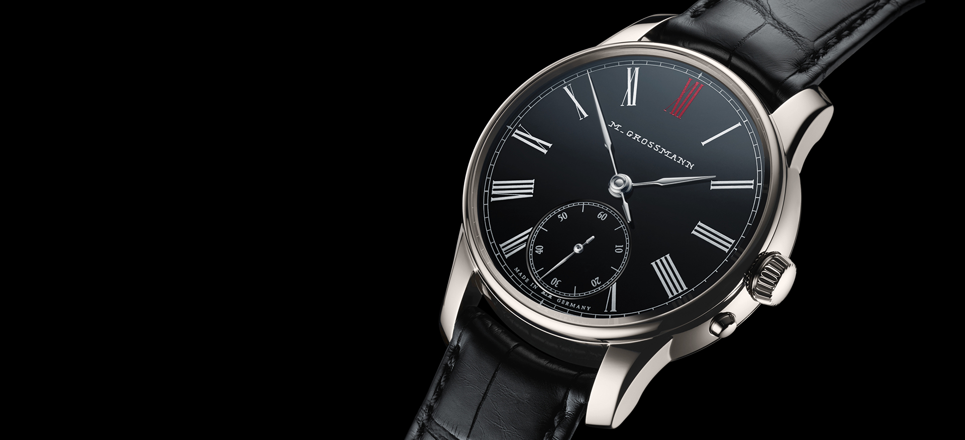 Die auf acht Stück limitierte Edition EMAIL Römisch Vintage interpretiert die Philosophie des Hauses auf zeitgemäße Weise: Ihr Thema ist der Kontrast von Schwarz, Weiß und Rot, der die Uhrmacherkunst von Moritz Grossmann in die Moderne trägt.