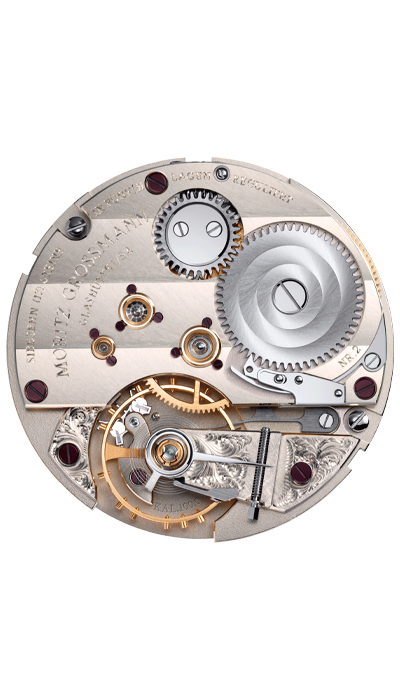 Erhabene Goldchatons, weiße Saphire als Lagersteine, über Feuer braunviolett angelassene Stahlschrauben, der breite Glashütter Streifenschliff und der dreistufige Sonnenschliff am Sperrrad sind weitere Blickfänge. Neben dem Markennamen MORITZ GROSSMANN GLASHÜTTE I/SA sind die traditionellen Angaben zum Uhrwerk auf der Platine von Hand graviert. Über die Werknummer und die Gehäusenummer lässt sich die Geschichte jeder einzelnen Uhr zurückverfolgen.