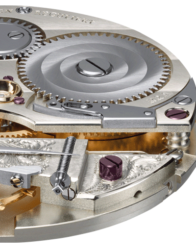 Die Aufzugsräder tragen eine polierte Kantenbrechung in der Verzahnung, die den Teilen die höchste Brillanz verleiht. Das Sperrrad als größtes dieser Räder ist zusätzlich mit einem traditionellen dreistufigen Sonnenschliff dekoriert und fügt sich so harmonisch in das Gesamtbild der breiten Streifen und der Handgravur ein.