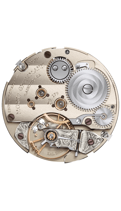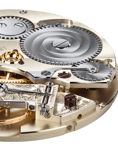 Grossmann’sche Unruh; Entriegelung der Zeigerstellung und Start des Uhrwerkes durch seitlichen Drücker; Gangreserveanzeige in Balkenform durch ein zweifarbiges Anzeigesegment, angetrieben durch ein Differenzialgetriebe; raumsparendes, modifiziertes Glashütter Gesperr mit Rücklauf; Regulierung mit Grossmann’scher Rückerschraube auf gestuftem Unruhkloben; Pfeilerwerk mit 2/3-Platine und Gestellpfeilern aus naturbelassenem Neusilber, 2/3-Platine, Unruh- und Ankerradkloben handgraviert; breiter, waagerechter Glashütter Streifenschliff, 3-fach gestufter Sonnenschliff auf dem Sperrrad; hervorstehende Goldchatons mit aufgesetzten Schrauben; separat herausnehmbarer Kupplungsaufzug; Sekundenstopp bei Zeigerstellung
