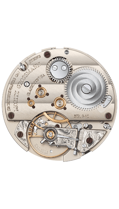 Grossmann’sche Unruh / Entriegelung der Zeigerstellung und Start des Uhrwerkes durch seitlichen Drücker / exakt springende Datumsanzeige durch außen umlaufenden Zeiger / jederzeit vor- und rückwärts korrigierbares Datum über eine zweite Stellkrone bei 10 Uhr, raumsparendes, modifiziertes Glashütter Gesperr mit Rücklauf / Regulierung mit Grossmann‘scher Rückerschraube auf gestuftem Unruhkloben / Pfeilerwerk mit 2/3-Platine und Gestellpfeilern aus naturbelassenem Neusilber, 2/3-Platine, Unruh- und Ankerradkloben handgraviert / breiter, waagerechter Glashütter Streifenschliff, 3-fach gestufter Sonnenschliff auf dem Sperrrad / hervorstehende Goldchatons mit aufgesetzten Schrauben / separat herausnehmbarer Kupplungsaufzug / Sekundenstopp bei Zeigerstellung