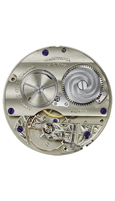 Grossmann’sche Unruh; Entriegelung der Zeigerstellung und Start des Uhrwerkes durch seitlichen Drücker; raumsparendes, modifiziertes Glashütter Gesperr mit Rücklauf; Regulierung mit Grossmannʼscher Rückerschraube auf gestuftem Unruhkloben; Pfeilerwerk mit 2/3-Platine und Gestellpfeilern aus naturbelassenem Neusilber; Unruh- und Ankerradkloben handgraviert; breiter, waagerechter Glashütter Streifenschliff; dreifach gestufter Sonnenschliff auf dem Sperrrad; separat herausnehmbarer Kupplungsaufzug; Sekundenstopp bei Zeigerstellung; zentrales Sekundenrad; neu entwickeltes Modul zur Anzeige der vollen Stunden in ausgewählten Metropolen; Korrekturmechanismus bei 10 Uhr zum Einstellen des Stundenzeigers bei Wechsel des eigenen Standortes