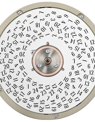 Unter dem Zifferblatt bewegt sich eine Scheibe, die mit einem 24-zahnigen Rastrad verbunden ist. Diese ist mit einer Vielzahl an Ziffern von 1 bis 24 bedruckt, die in einem Winkel von jeweils 15 Grad auf insgesamt sechs Ringen angeordnet sind.