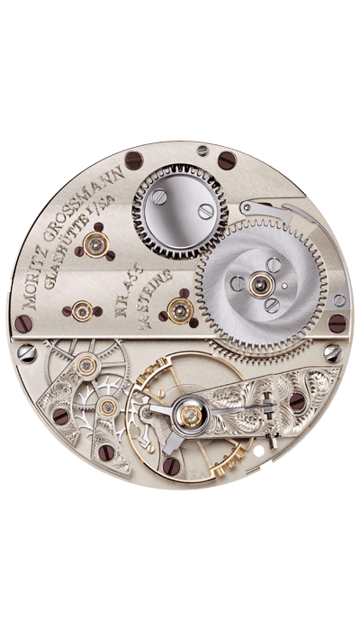 Die Lagersteine – weiße Saphire – sind in hervorstehenden Goldchatons eingefasst. Gemeinsam mit den aufgesetzten, einzeln von Hand angelassenen Stahlschrauben überragen sie die Platinenoberfläche. Damit orientiert man sich am Vorbild alter Grossmann-Taschenuhren und erreicht, dass die Lagersteine einzeln entnommen und gereinigt werden können, ohne die Platine bei der Montage zu beschädigen.