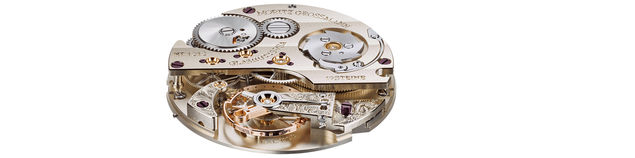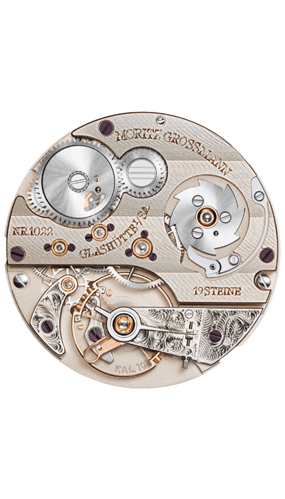 Die Lagersteine – weiße Saphire – sind in hervorstehenden Goldchatons eingefasst. Gemeinsam mit den aufgesetzten, einzeln von Hand angelassenen Stahlschrauben überragen sie die Platinenoberfläche. Damit orientiert man sich am Vorbild alter Grossmann-Taschenuhren und erreicht, dass die Lagersteine einzeln entnommen und gereinigt werden können, ohne die Platine bei der Montage zu beschädigen.