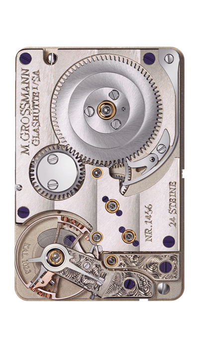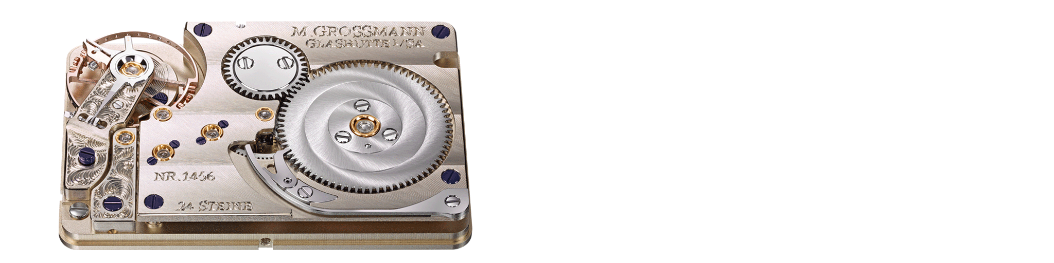 Grossmann’sche Unruh; raumsparendes, modifiziertes Glashütter Gesperr mit Rücklauf; Regulierung mit Grossmannʼscher Rückerschraube auf gestuftem Unruhkloben; Pfeilerwerk mit 2/3-Platine und Gestellpfeilern aus naturbelassenem Neusilber; Unruh- und Ankerradkloben handgraviert; breiter, waagerechter Glashütter Streifenschliff; 3-fach gestufter Sonnenschliff auf dem Sperrrad; hervorstehende Goldchatons mit aufgesetzten Schrauben; separat herausnehmbarer Kupplungsaufzug; Sekundenstopp bei Zeigerstellung