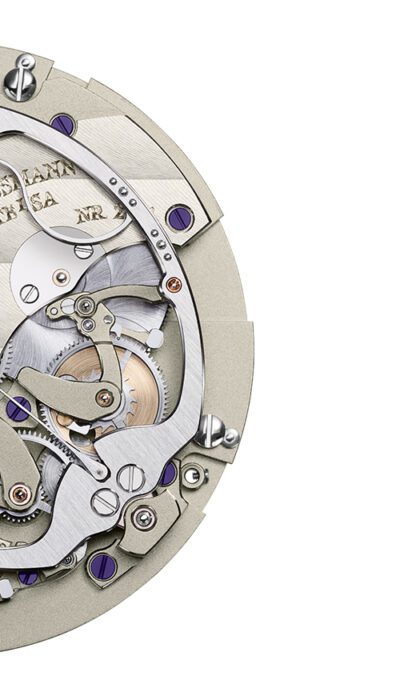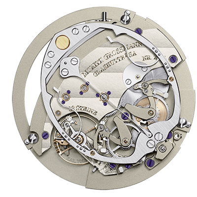 Grossmann’sche Unruh; Klinkengesperr in Reduktionsgetriebe; Regulierung mit Grossmannʼscher Rückerschraube auf gestuftem Unruhkloben; Pfeilerwerk mit 2/3 Platine und Gestellpfeilern aus naturbelassenem Neusilber, 2/3 Platine und Unruhkloben handgraviert; breiter, waagerechter Glashütter Streifenschliff, doppelt gestufter Sonnenschliff auf der Federhaustrommel; hervorstehende Goldchatons mit aufgesetzten Schrauben; separat herausnehmbarer Kupplungsaufzug; Sekundenstopp am Unruhreif bei Zeigerstellung; Automatikaufzug mit Schwinghammer, beidseitig wirkende Klinkenräder; Automatikfreilauf mittels Ankerklinke, Handaufzug über Wippenaufzug