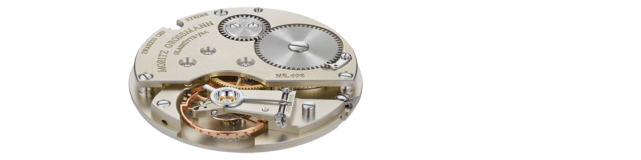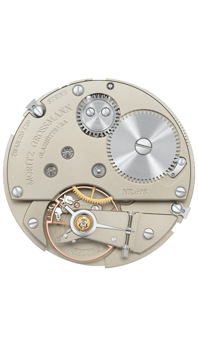 Grossmann’sche Unruh; Entriegelung der Zeigerstellung und Start des Uhrwerkes durch seitlichen Drücker; raumsparendes, modifiziertes Glashütter Gesperr mit Rücklauf; Regulierung mit Grossmannʼscher Rückerschraube auf gestuftem Unruhkloben; Pfeilerwerk mit 2/3-Platine und Gestellpfeilern aus naturbelassenem Neusilber; separat herausnehmbarer Kupplungsaufzug; Sekundenstopp bei Zeigerstellung