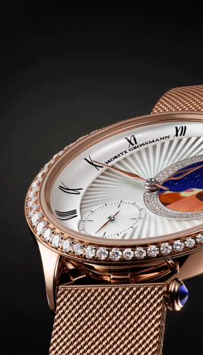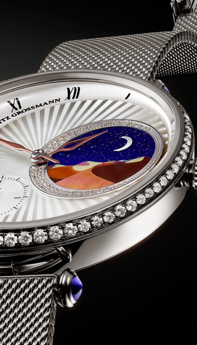 Inspiriert von der Schönheit und Mystik des Orients ist eine Uhr von magischer Ausstrahlung entstanden, die Uhrmacher- und Juwelierkunst in höchster Perfektion vereint. Das Zifferblatt entführt den Betrachter in eine geheimnisvolle nächtliche Landschaft aus Sanddünen mit einem darüber scheinenden Mond. Sie wird aus feinsten, präzise zugeschnittenen Perlmuttplättchen in aufwendiger Handarbeit zusammengefügt. Durch das verschieden farbige Perlmutt ist jedes Bild ein kleines Unikat. 62 weiße Brillanten und eine strahlende, asymmetrische Guilloche verleihen dem traumhaften Motiv einen funkelnden Rahmen.