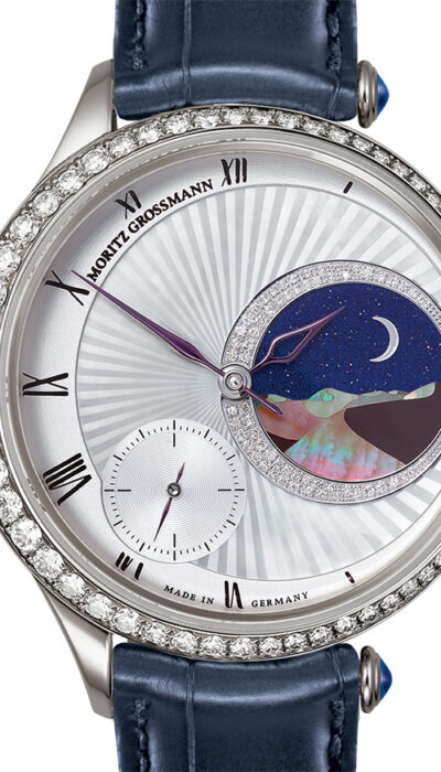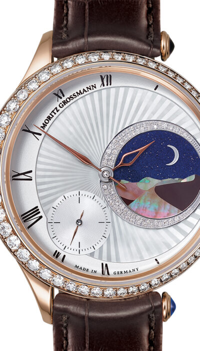 Das hochkarätige Zifferblatt der TEFNUT 1001 Nights zeigt in dem dezentralen Diamantring aus 62 Brillanten eine Dünenlandschaft im Mondlicht. Dieses Bild ist als kunstvolle Einlage aus Perlmutt gearbeitet. Dazu werden unterschiedliche Perlmuttsegmente präzise zugeschnitten und zu einer ausdrucksvollen Szenerie komponiert. Durch die irisierende Oberfläche von Perlmutt gleicht kein Bild vollkommen dem anderen. Aus der faszinierenden Kombination von Natur, High-Tech und Handarbeit entsteht ein kleines Unikat voll großer Emotionen.