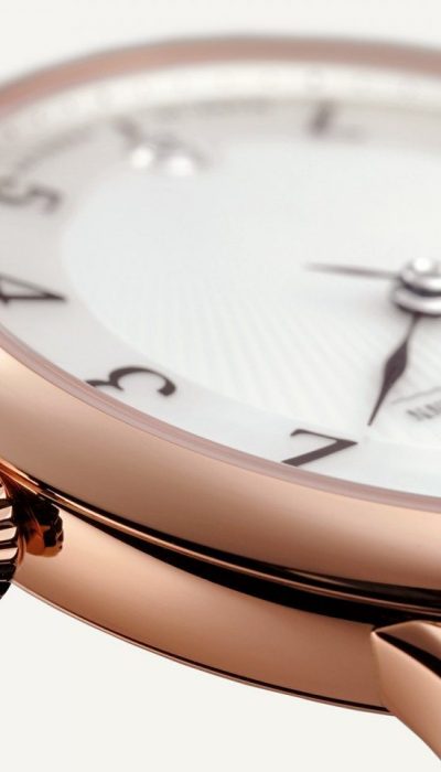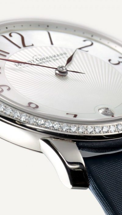 Zwei handgefertigte Zeiger aus braunviolett angelassenem Stahl sorgen mit ihrer filigran geschwungenen, zarten Nodus-Form für besondere Akzente. Eine goldene, wahlweise mit 80 Brillanten sertierte Lünette rahmt das elegante Gesicht der Uhr. Sie beweist, dass strahlende Brillanten und technische Brillanz durchaus vereinbar sind.