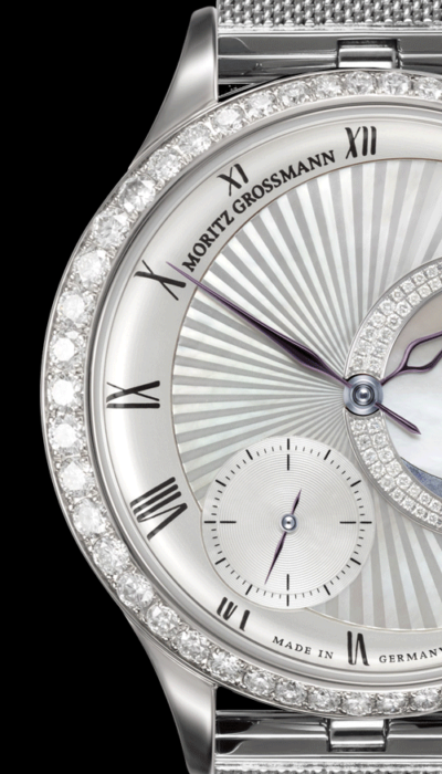 Perlmutt guillochiert, römische Ziffern, Mondscheibe aus Perlmutt, Diamantring aus 62 Brillanten