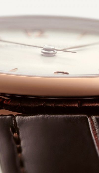 Die Anzeige vereint moderne Form und klassische Bauweise: Schlichte, fein bombierte Indexe aus Gold bzw. Edelstahl säumen das Zifferblatt, werden bei der „6“ und der „12“ jedoch auf markante Weise von zwei klar gezeichneten, arabischen Ziffern unterbrochen.