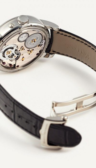Der konische Drücker unterhalb der Krone verweist auf den Grossmann’schen Handaufzug mit Drücker, dem perfektionierten Zeigerstellmechanismus. Ein kurzer Zug an der Aufzugskrone schaltet auf Zeigereinstellung um und stoppt gleichzeitig das Uhrwerk. Die Aufzugskrone geht sofort in ihre Ausgangsposition zurück, in der sich jetzt die Zeiger einstellen lassen. Über den Drücker wird das Uhrwerk anschließend wieder gestartet und der Mechanismus in seine Aufzugsfunktion zurückgesetzt.