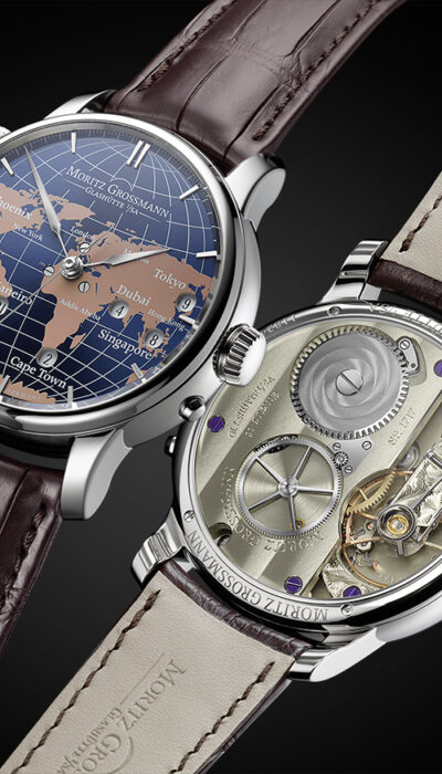 Das Modell UNIVERSALZEIT ermöglicht es, die Uhrzeit in verschiedenen Zeitzonen der Welt auf einen Blick zu erfassen. Das in Form einer Weltkarte gestaltete Zifferblatt bietet zeitliche und geografische Orientierung anhand von Zeitfenstern, die exakt an Koordinaten ausgerichtet und mit Städtenamen versehen sind. Insgesamt sechs Fenster zeigen die Stunde von 1 bis 24 in jeweils einer von sechs Metropolen an