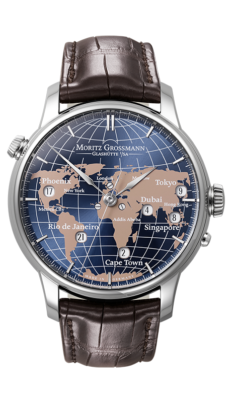 Das in Form einer Weltkarte gestaltete Zifferblatt bietet zeitliche und geografische Orientierung anhand von Zeitfenstern, die exakt an Koordinaten ausgerichtet und mit Städtenamen versehen sind. Insgesamt sechs Fenster zeigen die Stunde von 1 bis 24 in jeweils einer von sechs Metropolen an.
