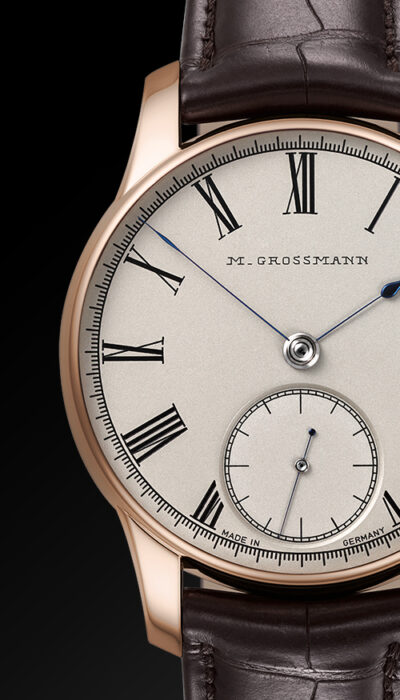 Stunde und Minute, kleine Sekunde mit Sekundenstopp, Grossmann’scher Handaufzug mit Drücker
