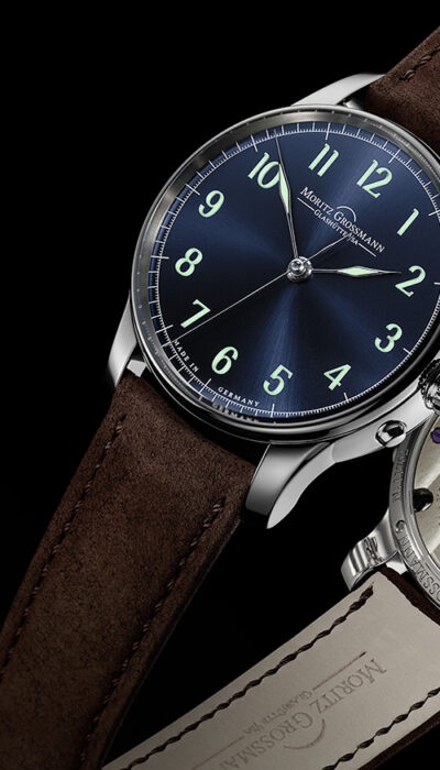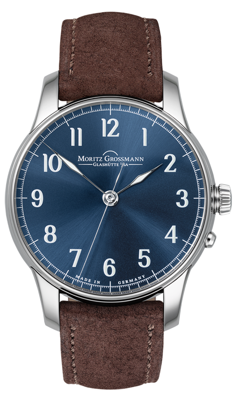 Die handgefertigten Zeiger aus über offener Flamme gebläutem Stahl bewegen sich in edlem Kontrast über das lachsfarbene Zifferblatt. Das Moritz Grossmann- Logo und der Schriftzug Made in Germany in schwarzen Lettern, bilden zusammen mit den in Blau gehaltenen Zeigern und Ziffern ein harmonisches Gesamtbild. Sie unterstreichen das klassische Understatement der Uhr.